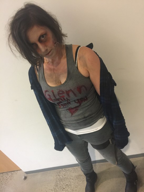 This year I went with a Walking Dead theme and dressed up as Maggie – as a zombie. There were a few people that were behind on episodes and thought I was a spoiler, but no worries, Maggie is still alive. For now.